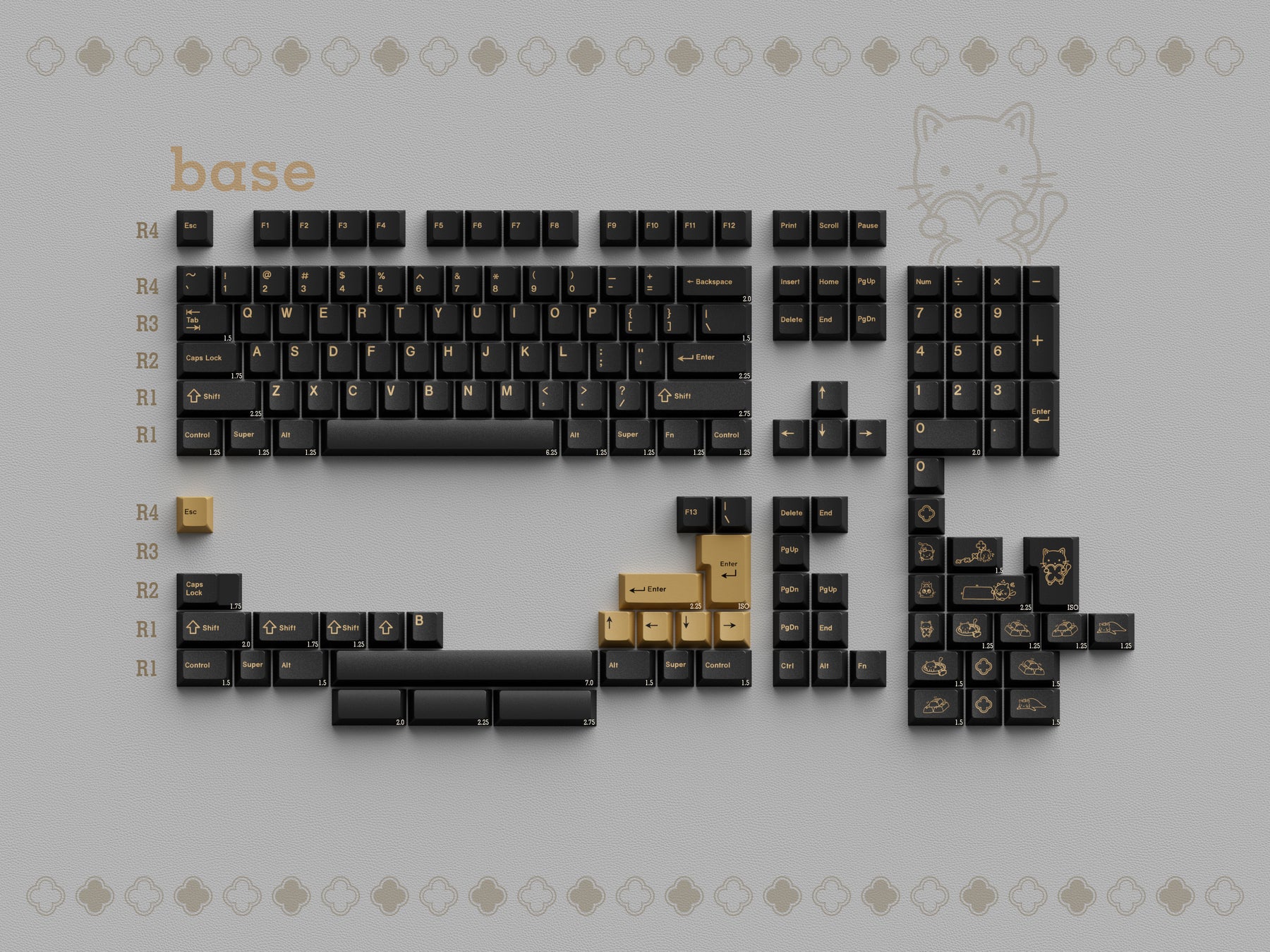 "A sophisticated blend of deep black and soft gold, designed to bring understated luxury to your setup. Inspired by classic jewelry tones and a love for cats, Onyx balances clean and sleek lines with a touch of personality, featuring elegant legends, refined colorways, and charming cat-themed novelties."