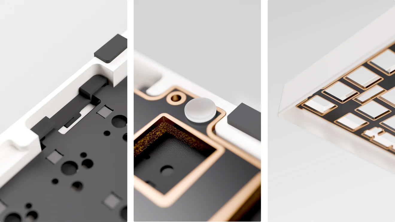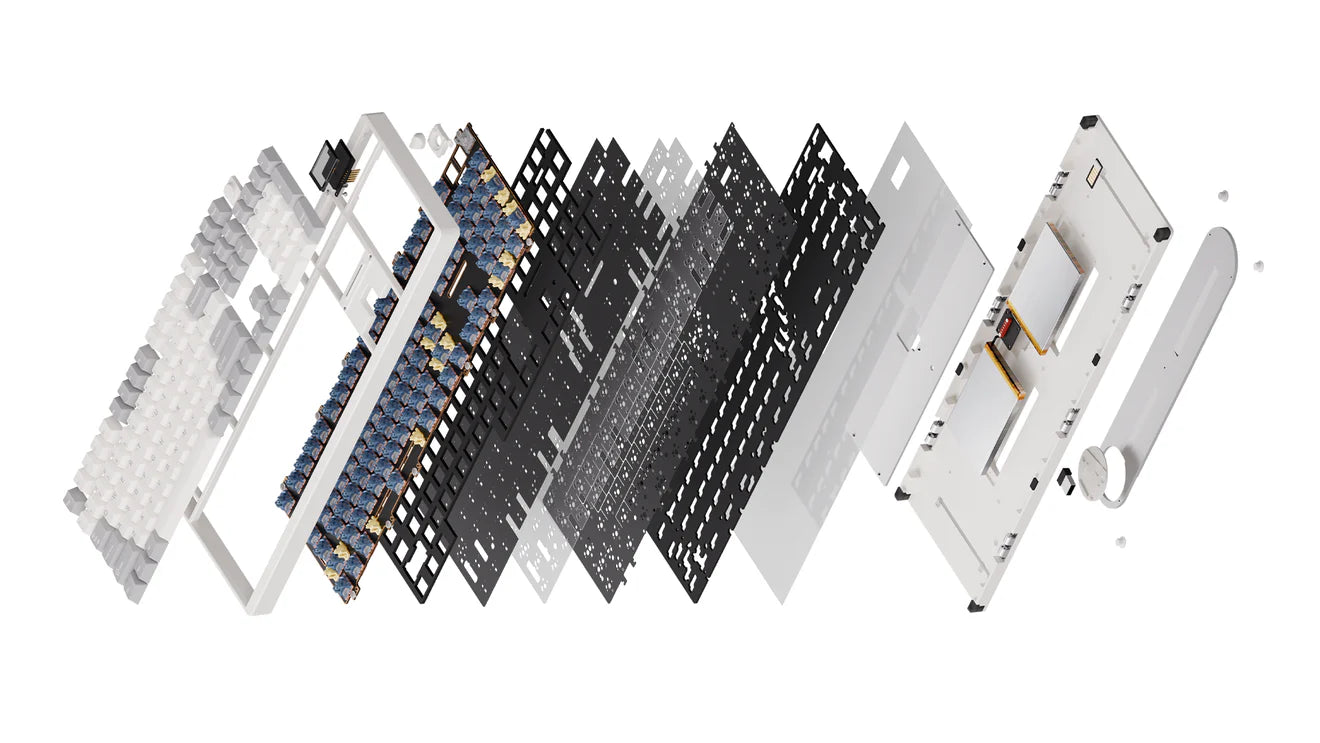 Cinque strati di isolamento acustico — tra cui plate foam, switch foam, pad acustici in PET e case foam — lavorano in sinergia per eliminare le vibrazioni e offrire un profilo sonoro profondo e pulito.